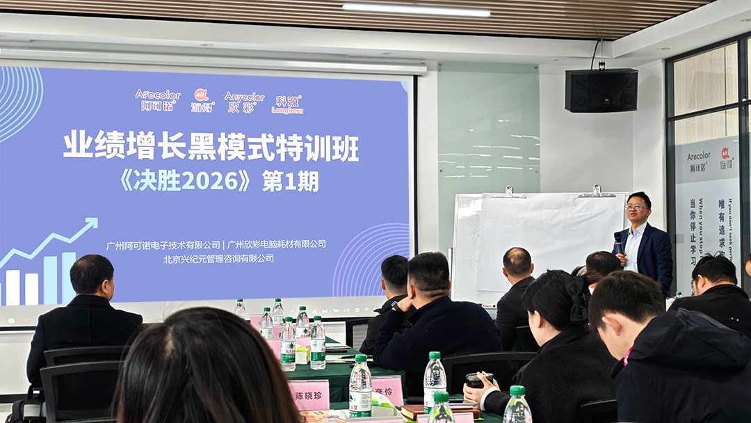 2026年1月23日-24日,广州阿可诺电子技术有限公司、广州欣彩电脑耗材有限公司携手北京兴纪元管理咨询有限公司打造的“业绩增长黑模式特训班”《决胜2026》第1期培训交流活动在广州市黄埔区广州创新谷12楼广州欣彩公司全新培训会议室成功举办。